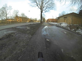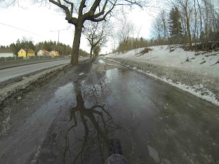 Bra gjort Jon! Just det där är anledningen till att jag väntar med att ta fram cykeln och fortfarande går för det mesta. Cykelvägarna är alldeles för illa skötta. En av anledningarna till att det blir så mycket vatten just där är att det vattnet ofta blir ”inlåst” av snövallar från båda sidorna, utan att det finns någon brunn det kan rinna ned i. Och så länge den omkringliggande snön smälter om dagarna fylls pölarna på, så det tar ett bra tag för dem att dunsta.
