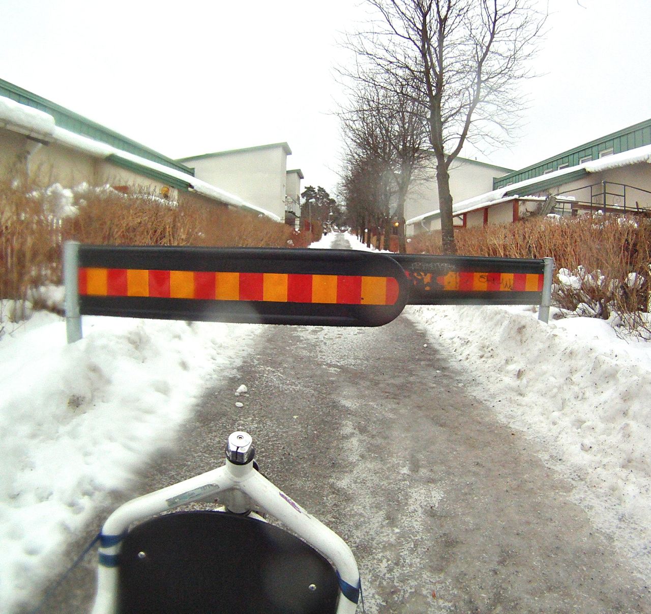 I Hässelby villastad finns några exempel på när man spärrar av cykelbanan för att hindra trafik med stora motorfordon. Problemet är att man samtidigt hindrar trafiken som vägen är till för. Hur skulle det se ut om man rakt över tex en motorväg bygger hinder för gåendetrafik och cykeltrafik?