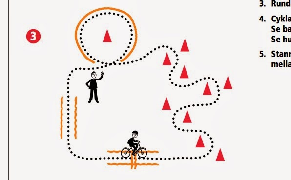 Det kan vara roliga hinderbanor, med olika moment som vickbräda, cykla på begränsad bredd, slalombana, cykla på luriga underlag, kluriga svängar. Träna manöverfärdighet på grus.