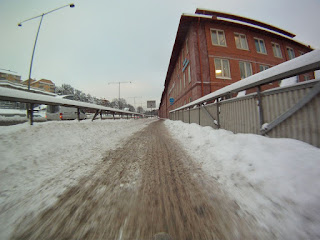 Idag på väg in till city tyckte jag mig ana bitvis en stor skillnad på snöröjningen av cykelbanan. Visst ser jag sviterna av tidigare felaktigt plogad cykelbana med lite kullerstenstendenser här och var av trampad packad snö. Men långa sträckor är asfalten helt saltren. Spännande! Har nya monstermaskinen börjat testats nu månne? Det ser ju väldigt bra ut, och inbjuder verkligen till cykling.