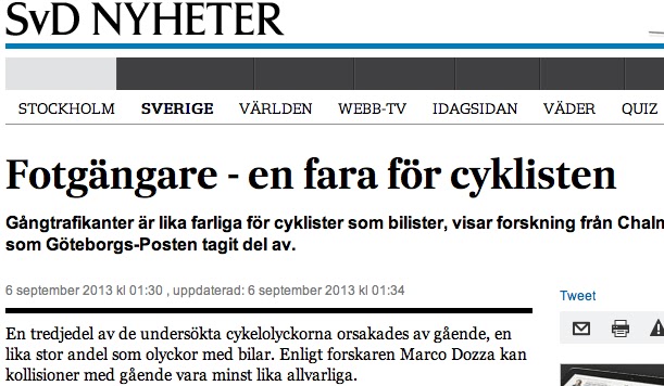 En studie från Chalmers om vad som orsakar olyckor för cyklande trafikanter är delvis kontroversiell. Och hur tolkar media rapporten? Fotgängare anges som stor orsak till olyckor på cykel. Traditionellt anses fotgängare ha lägst hastighet och krockvåld i trafiken.